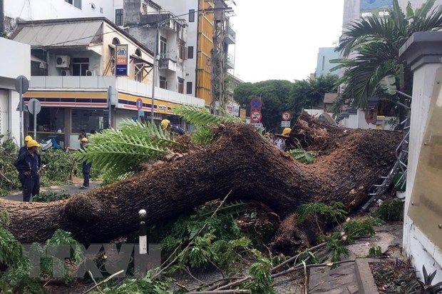 Khoảng 7 giờ sáng 3/4, một cây xanh lớn trong khuôn viên Trường Trung học cơ sở Trần Văn Ơn trên đường Nguyễn Văn Thủ (Quận 1, TP Hồ Chí Minh) bị bật gốc, đổ ra đường, làm nhiều người bị thương.
