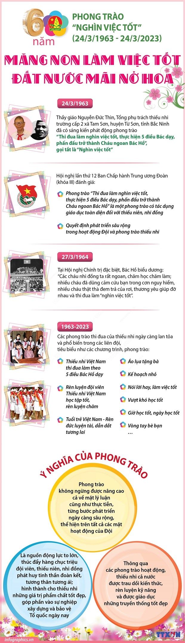 Trải qua 60 năm duy trì và phát triển, phong trào “Nghìn việc tốt” không ngừng phát triển ngày càng sâu rộng, thể hiện trên tất cả các mặt hoạt động của Đội Thiếu niên Tiền phong Hồ Chí Minh.