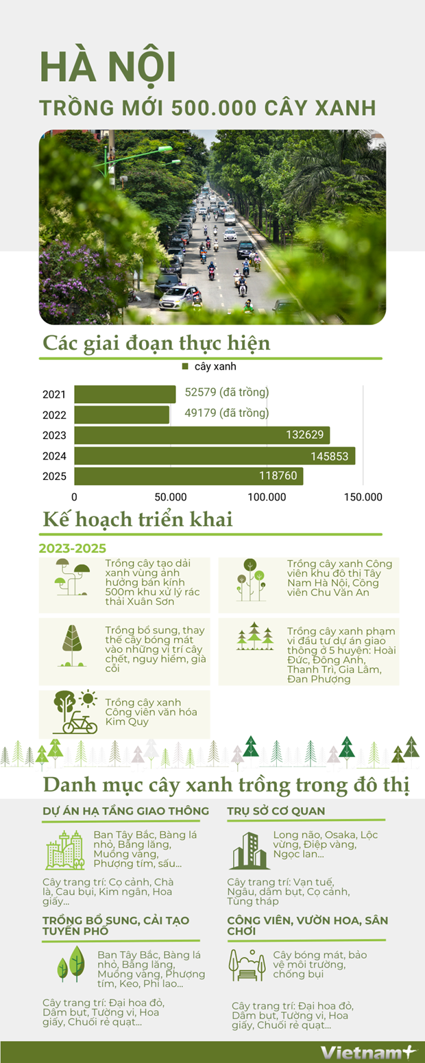 Ủy ban Nhân dân thành phố Hà Nội vừa ban hành kế hoạch trồng 500.000 cây xanh đô thị trên địa bàn giai đoạn 2021-2025. Theo đó, năm 2023 thành phố sẽ trồng mới 133.629 cây xanh.