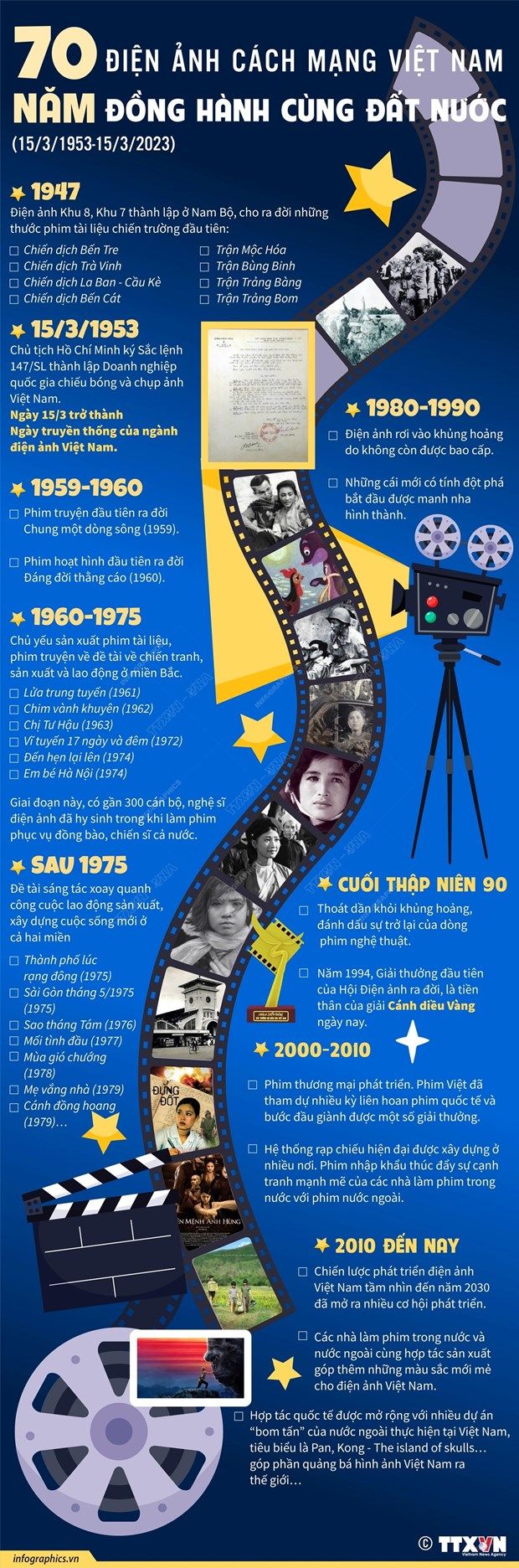 Bảy thập kỷ qua, điện ảnh cách mạng Việt Nam luôn đồng hành với từng giai đoạn lịch sử dân tộc, phản ánh chân thực và sinh động cuộc đấu tranh bảo vệ Tổ quốc, sự nghiệp xây dựng, phát triển đất nước.