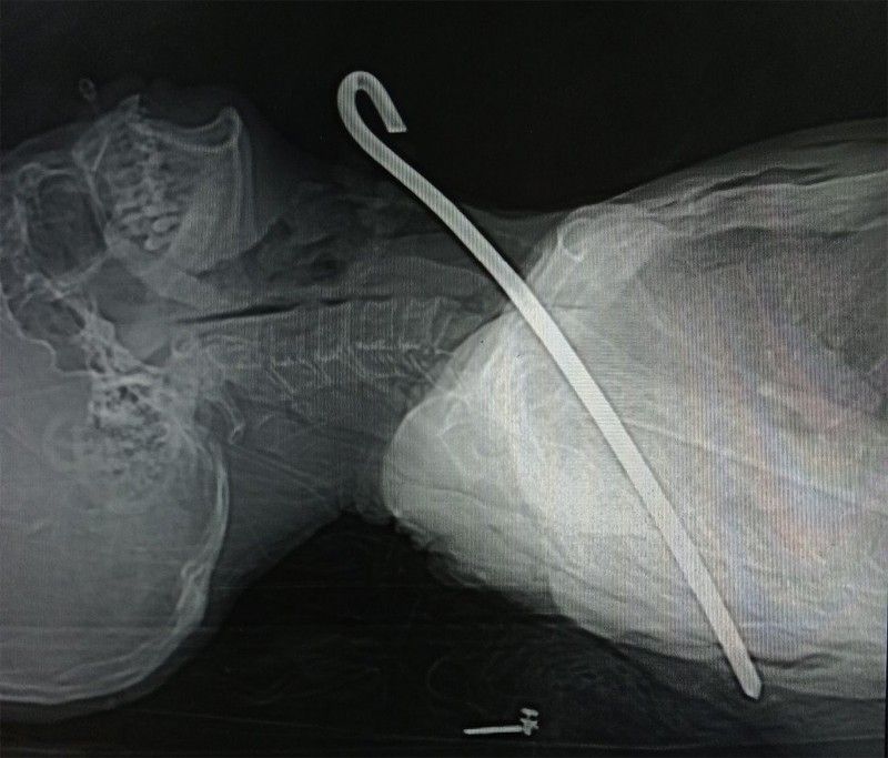 Ông được người nhà đưa vào bệnh viện cấp cứu trong tình trạng bị thanh sắt dài 30cm xuyên từ vùng cổ qua phổi phải và trung thất xuống vùng ngực.