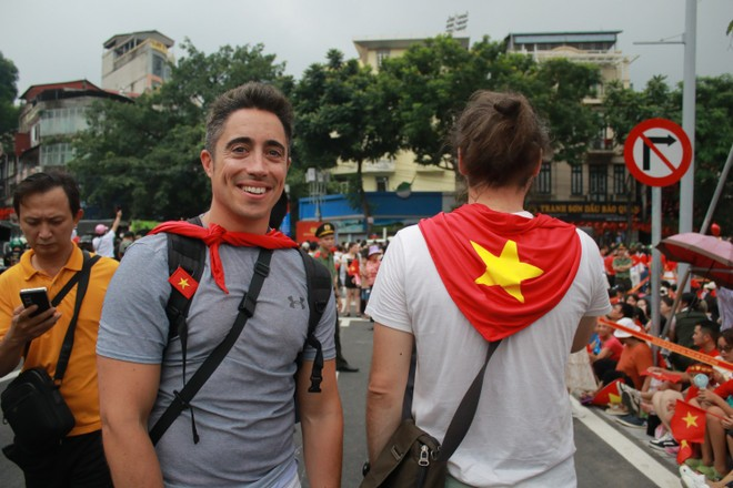 Hào hứng chỉ vào hai hình dán cờ đỏ sao vàng, một trên má, một trên ngực áo, cặp du khách người Pháp chia sẻ "được ở Việt Nam những ngày này giống như một đặc quyền."