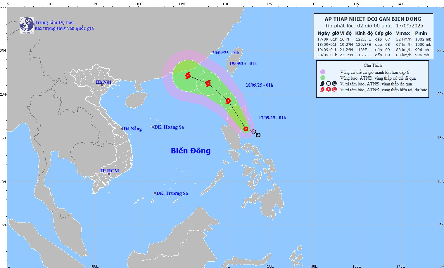 Dự báo đến 1 giờ ngày 18/9, áp thấp nhiệt đới di chuyển theo hướng Bắc Tây Bắc, tốc độ khoảng 15 km/h và có khả năng mạnh lên thành bão.