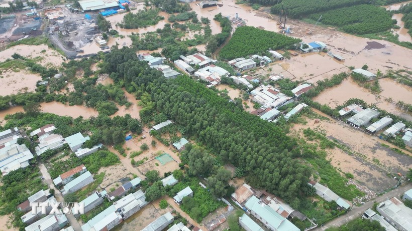 Tối 12/9, nước lũ sông Buông dâng cao, gây ngập sâu gần 1 mét ở nhiều khu dân cư và sân trường trung học cơ sở Phước Tân 1 (phường Phước Tân, tỉnh Đồng Nai).
