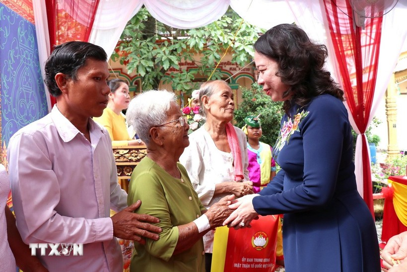 Nhân kỷ niệm 95 năm Ngày thành lập Mặt trận Dân tộc Thống nhất Việt Nam, Phó Chủ tịch nước Võ Thị Ánh Xuân dự Ngày hội Đại đoàn kết toàn dân tộc tại ấp Nguyệt Lãng B, xã Bình Phú, tỉnh Vĩnh Long.