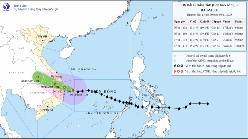 Theo Giám đốc Trung tâm Dự báo Khí tượng Thủy văn Quốc gia, bão số 13 có khả năng duy trì cường độ mạnh nhất (cấp 14-15) trong khoảng 4-6 giờ tới, trước khi hoàn lưu phía Tây của bão va chạm đất liền.