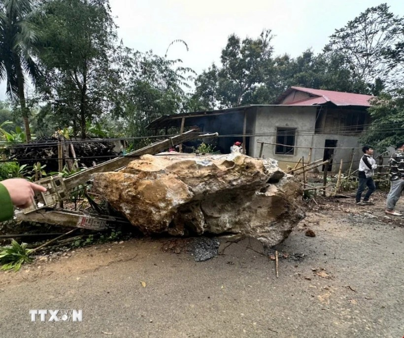 Nhiều tảng đá nặng hàng chục tấn lăn xuống chân núi thôn Cả, xã Ban Công, huyện Bá Thước (tỉnh Thanh Hóa), nơi có 5 hộ dân đang sinh sống phía dưới, may mắn không gây thiệt hại về người.