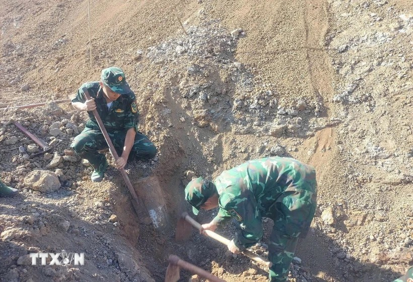 Trong lúc cho máy múc đào ao chứa nước tưới vườn cây, ông Nguyễn Lý Tưởng ở thôn 3, xã Bom Bo, huyện Bù Đăng, tỉnh Bình Phước, phát hiện quả bom, báo chính quyền địa phương.