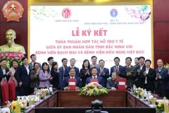 Tại Lễ Ký kết, Chủ tịch UBND tỉnh Bắc Ninh Vương Quốc Tuấn và Giám đốc Bệnh viện Bạch Mai và Bệnh viện Hữu nghị Việt Đức, ký kết Biên bản ghi nhớ hợp tác hỗ trợ y tế giai đoạn 2025-2030.