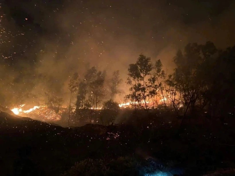 Do thời tiết khô kết hợp với gió lớn nên đám cháy tại núi Phật Tích (xã Phật Tích, huyện Tiên Du, tỉnh Bắc Ninh) nhanh chóng lan mạnh.