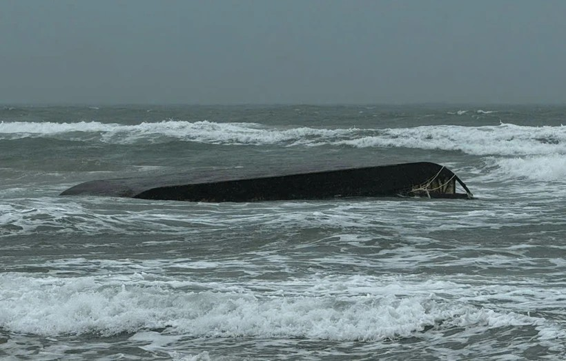 Phát hiện sà lan lật úp và bồn nghi chứa hóa chất trôi dạt trên biển Quảng Ngãi