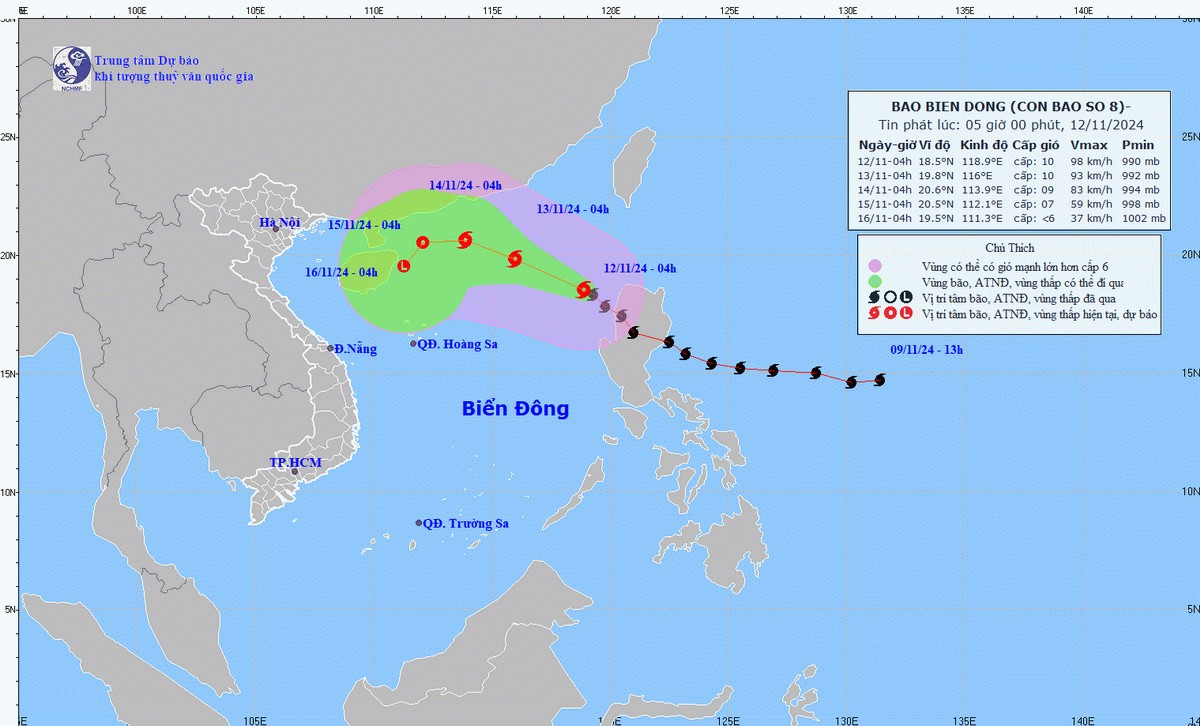 Trung tâm Dự báo Khí tượng Thủy văn Quốc gia cho biết sáng sớm 12/11, bão Toraji gần Biển Đông đã trở thành bão số 8, chuyển theo hướng Tây Bắc, tốc độ khoảng 10-15 km/h.