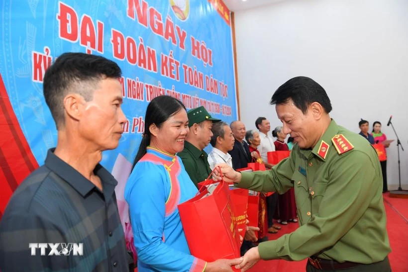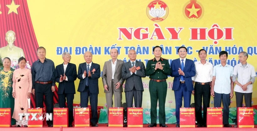 Dự ngày hội đại đoàn kết toàn dân tộc, Đại tướng Nguyễn Tân Cương và Bí thư Tỉnh ủy Quảng Ngãi Bùi Thị Quỳnh Vân đã tặng quà cho người có công, người cao tuổi, hộ nghèo, cận nghèo.