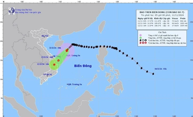 Lúc 1h ngày 11/11, vị trí tâm bão số 7 ở vào khoảng 17,9 độ Vĩ Bắc; 112,1 độ Kinh Đông; sức gió mạnh nhất vùng gần tâm bão mạnh cấp 9, giật cấp 11, di chuyển theo hướng Tây Nam, tốc độ 10-15 km/h.