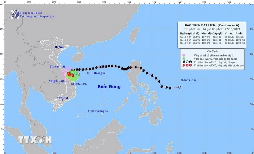Đến 4 giờ ngày 28/10, áp thấp nhiệt đới di chuyển theo hướng Đông Nam, gió mạnh cấp 6, giật cấp 8, tốc độ 3-5km/h, trên đất liền các tỉnh Thừa Thiên-Huế, Quảng Nam, thành phố Đà Nẵng.