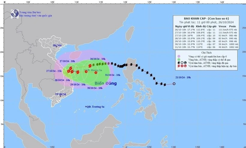 Dự báo đến 10h ngày 27/10, bão số 6 di chuyển theo hướng Tây Tây Nam với tốc độ 15-20 km/h, trên vùng biển ngoài khơi Trung Trung Bộ; sức gió mạnh nhất cấp 10-11, giật cấp 14.