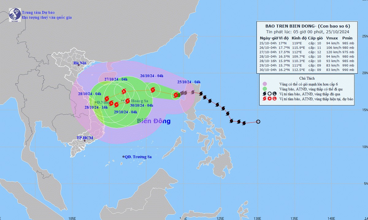 Từ 4 giờ ngày 25/10 đến 4 giờ ngày 27/10, bão di chuyển chậm lại có khả năng đổi hướng Đông Nam mỗi giờ đi được 5-10km, sau có khả năng đổi hướng Đông, cường độ có suy yếu dần.