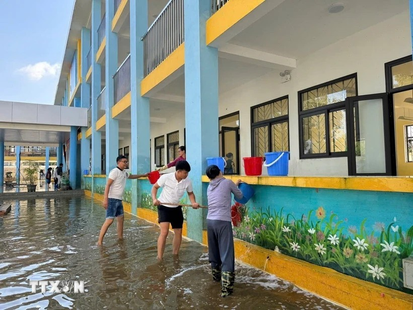 Với phương châm nước rút đến đâu dọn vệ sinh đến đó, các giáo viên, nhân viên của nhà trường đã khẩn trương dọn rửa, cọ nền nhà để vừa bảo quản cơ sở vật chất, vừa tránh tình trạng bùn đất bám lại.