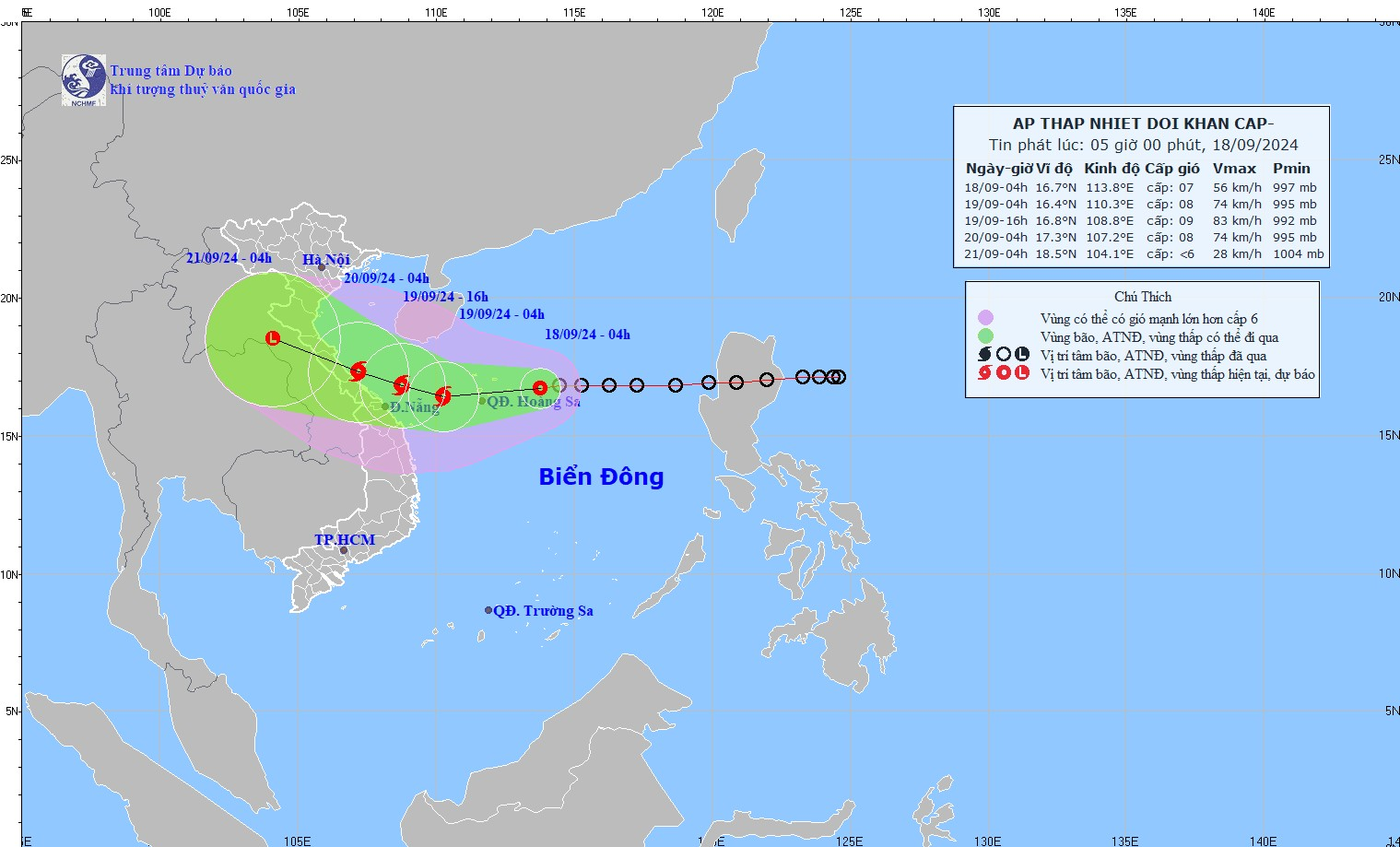 Hồi 4 giờ ngày 18/9, vị trí tâm áp thấp nhiệt đới ở vào khoảng 16,7 độ Vĩ Bắc; 113,8 độ Kinh Đông, cách Hoàng Sa khoảng 250km về phía Đông; dự báo có khả năng mạnh lên thành bão.