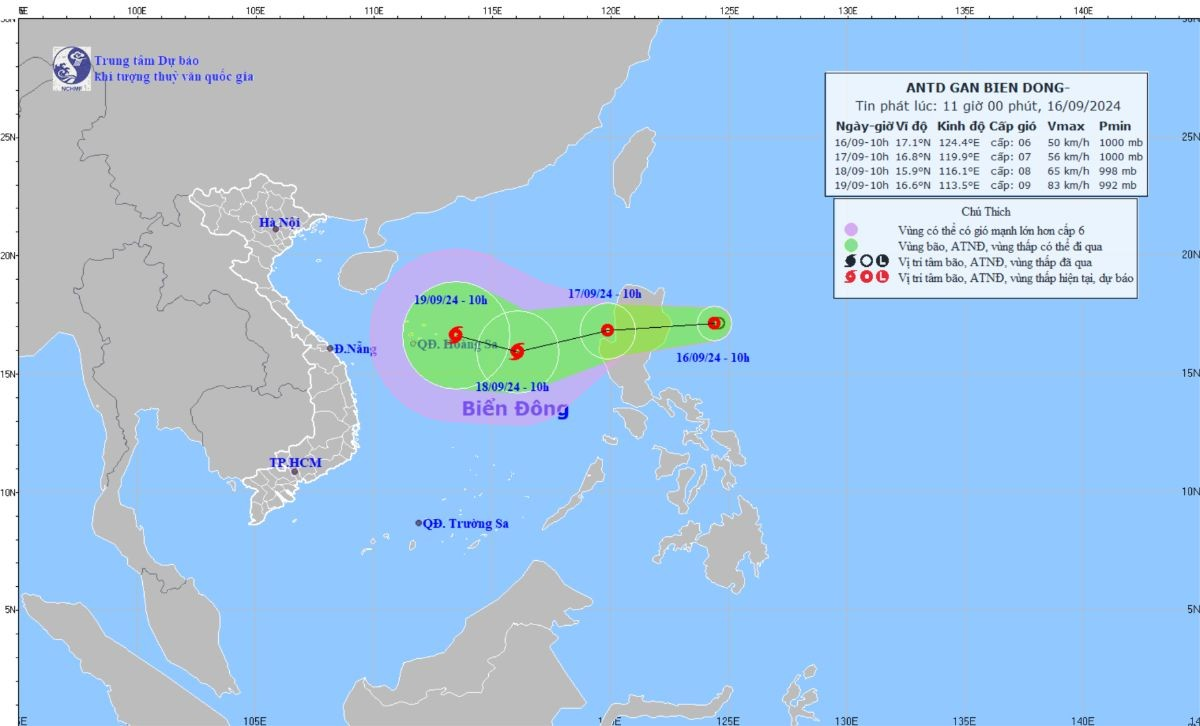 Theo Trung tâm Dự báo Khí tượng Thủy văn Quốc gia, ngày 18/9, áp thấp nhiệt đới di chuyển theo hướng Tây Tây Nam với tốc độ 20km/h với cường độ gió mạnh cấp 8, giật cấp 10 và mạnh lên thành bão.