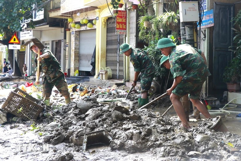 Ngày 13/9, nước lũ rút song bùn đất và rác thải vẫn ngổn ngang ở thành phố Yên Bái, hàng nghìn cán bộ, chiến sỹ, lực lượng vũ trang và người dân khẩn trương vệ sinh môi trường, khắc phục thiệt hại.