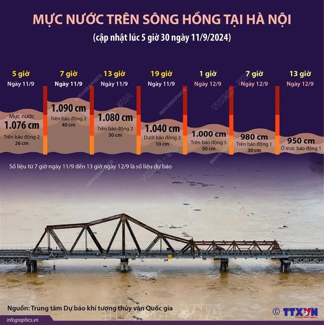 Trung tâm Dự báo Khí tượng Thủy văn Quốc gia đã phát đi bản tin thông báo lũ trên sông Hồng ở thành phố Hà Nội, theo đó, mực nước sông Hồng đang lên nhanh.