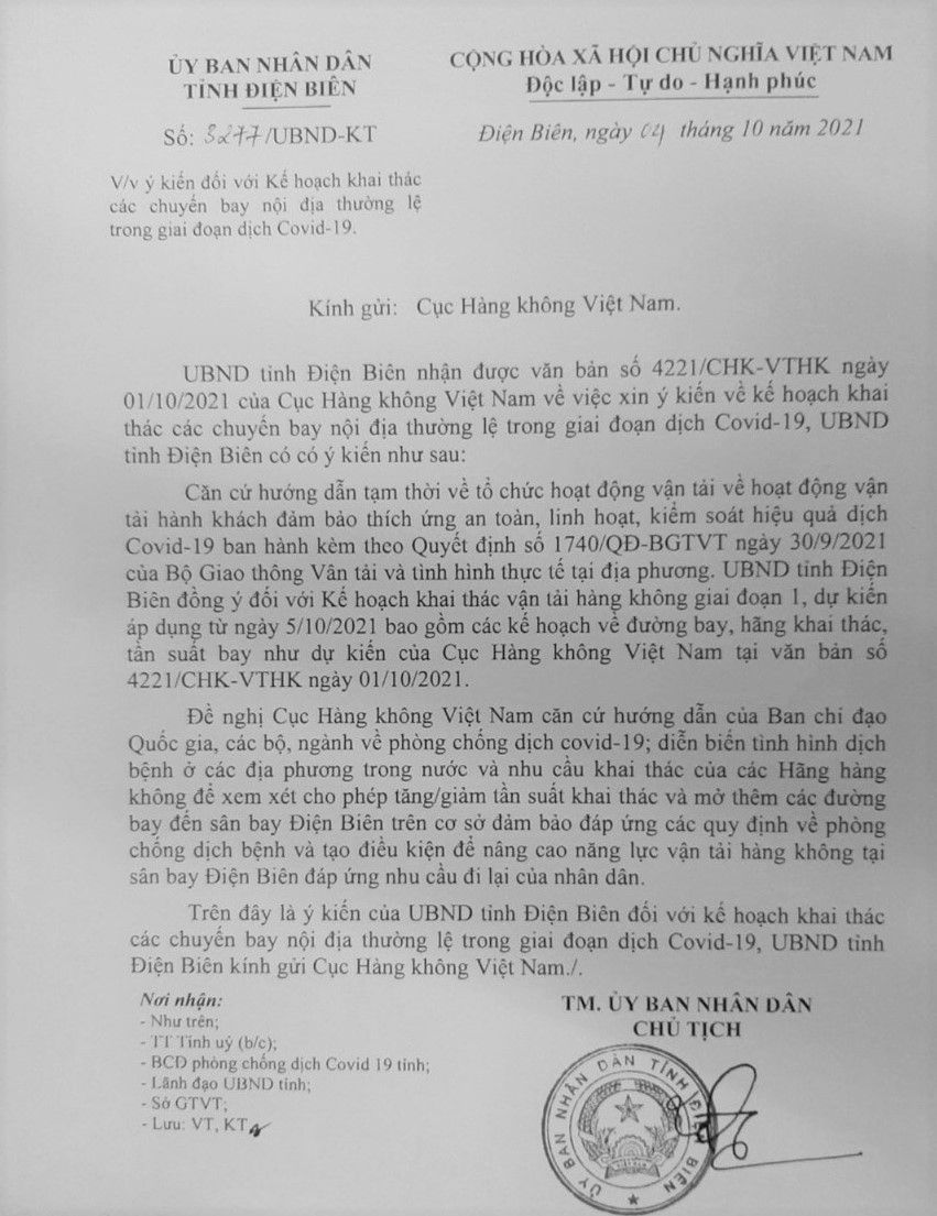 Ngày 4/10, UBND tỉnh Điện Biên đã có văn bản số 3277/UBND-KT về việc ý kiến đối với kế hoạch khai thác chuyến bay nội địa thường lệ trong giai đoạn dịch covid-19.