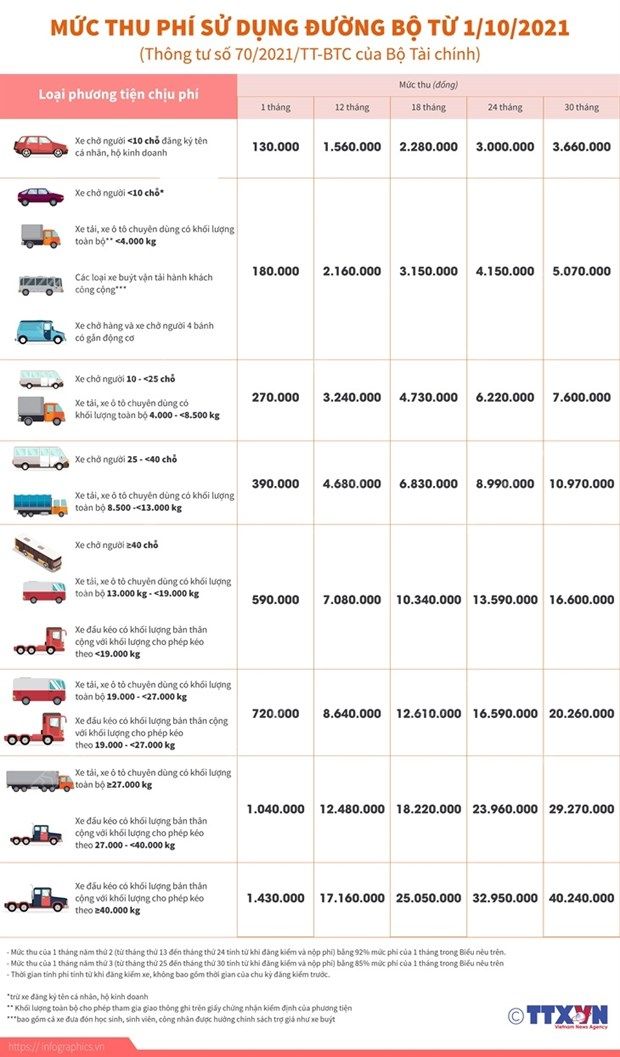 [Infographics] Chi tiết mức thu phí sử dụng đường bộ từ 1/10/2021