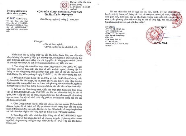 Ngày 4/9/2021, UBND tỉnh Bình Dương Ban hành công văn số 4435/UBND-NC về việc tạm dừng triển khai Công văn số 4395/UBND-NC ngày 03/9/2021 và công văn số 4423/UBND-KT ngày 04/9/2021 của UBND tỉnh.