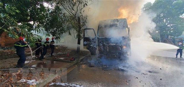 Chiếc xe đầu kéo mang biển kiểm soát 36R-01721 bị cháy rụi phần đầu khi đang di chuyển vào cổng Khu công nghiệp Tây Bắc Ga (thành phố Thanh Hóa), tài xế kịp thời thoát khỏi xe.