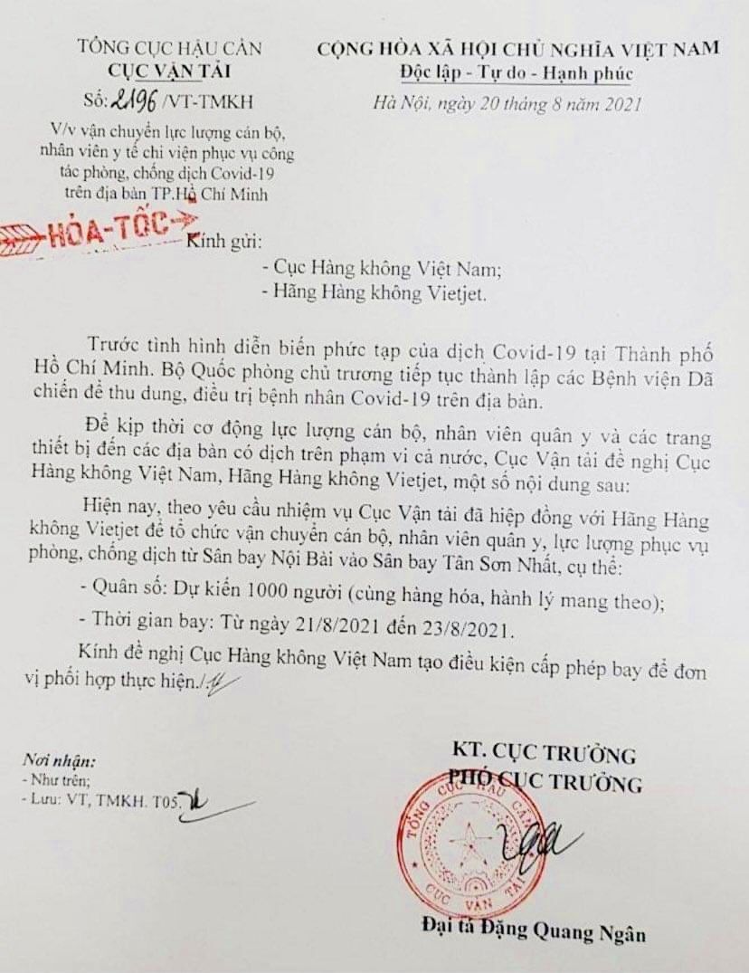 Tổng cục hậu cần vừa có văn bản gửi Cục hàng không VN, hãng hàng không Vietjet về việc vận chuyển lực lượng cán bộ nhân viên quân y, phục vụ công tác phòng chống dịch trên địa bàn TP.HCM.