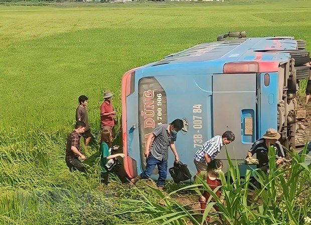 Tại hiện trường, xe khách sau khi lật nằm nghiêng, phần kính bên phải đầu xe bị vỡ vụn, nhiều vật dụng của người dân trên chuyến xe rơi vãi ra bên ngoài.