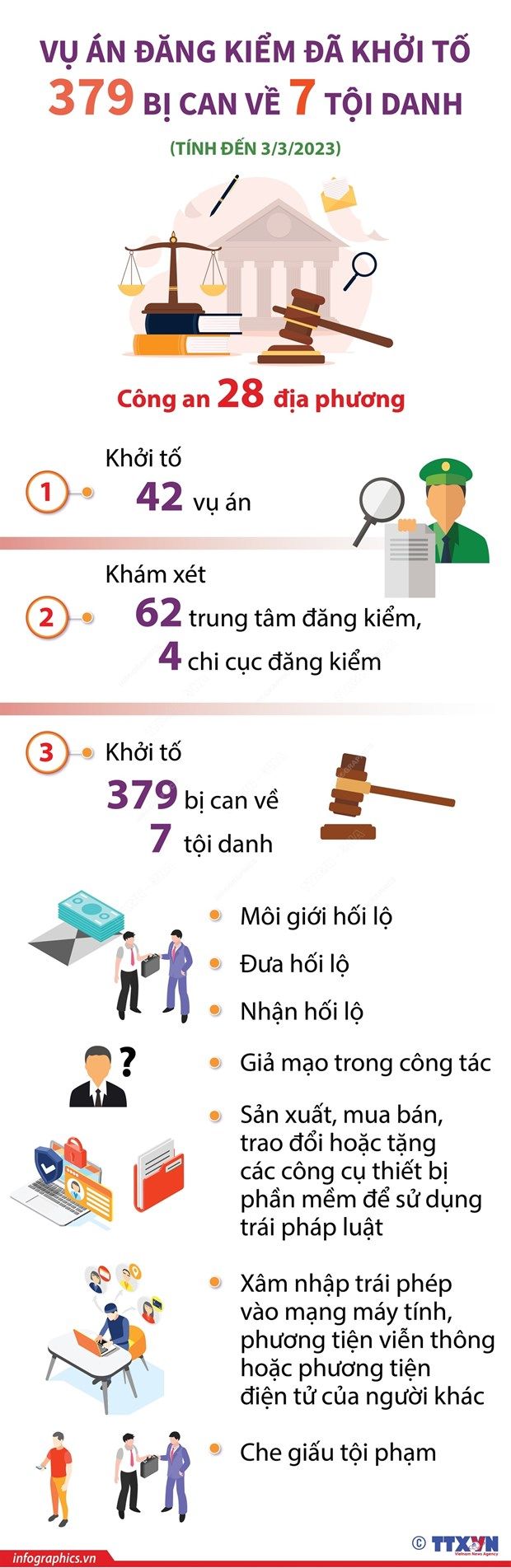 Liên quan đến vụ án đăng kiểm, chiều 3/3, Trung tướng Tô Ân Xô cho biết tính đến nay công an 28 địa phương khởi tố 42 vụ án; khám xét 62 trung tâm đăng kiểm..., khởi tố 379 bị can về 7 tội danh.