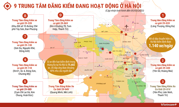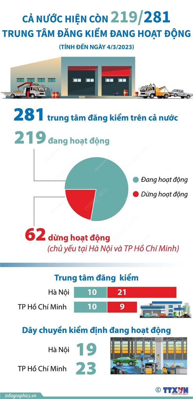 Theo Cục Đăng kiểm Việt Nam, tính đến ngày 4/3, cả nước có 281 trung tâm đăng kiểm với 489 dây chuyền kiểm định, trong đó có 62 trung tâm tạm dừng hoạt động, tập trung nhiều nhất tại Hà Nội và TP.HCM.