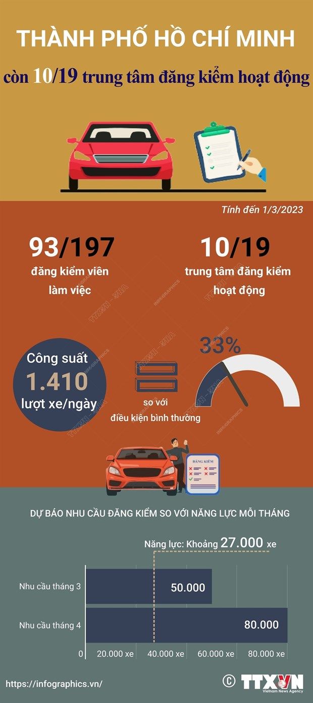 Tính đến ngày 1/3, TP.HCM còn 10/19 trung tâm đăng kiểm xe cơ giới đang hoạt động; có 93/197 đăng kiểm viên làm việc, công suất 1.410 lượt xe mỗi ngày, bằng 33% so với điều kiện bình thường.