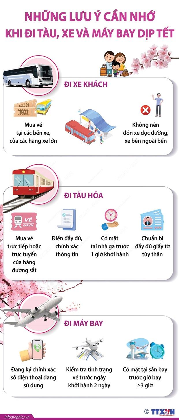 [Infographics] Những lưu ý cần nhớ khi đi tàu, xe và máy bay dịp Tết