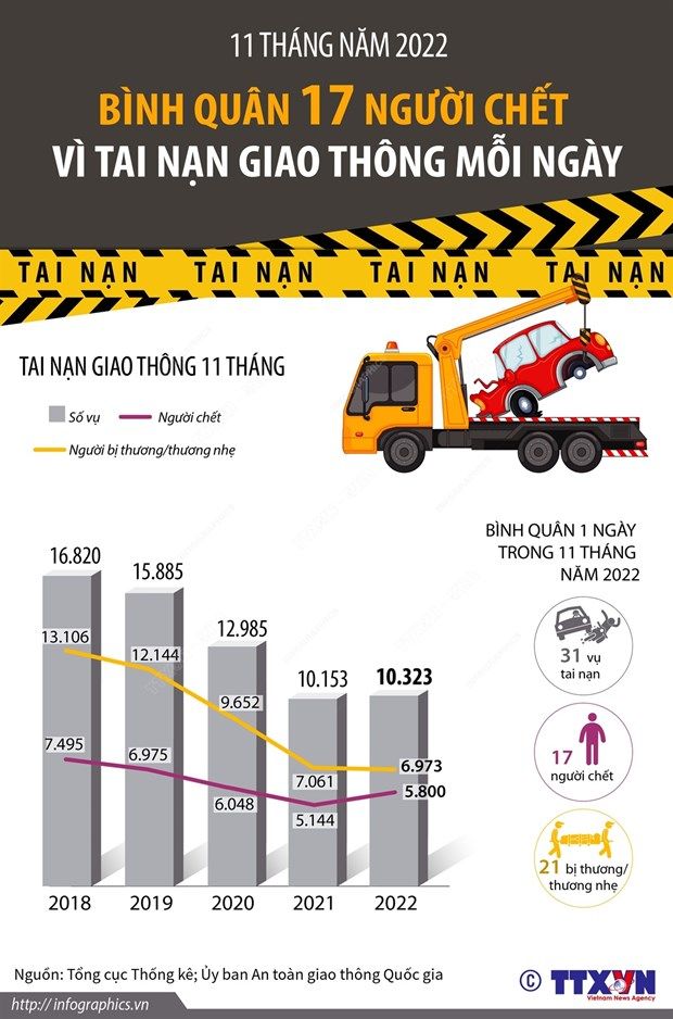 Trong 11 tháng năm 2022, toàn quốc xảy ra 10.323 vụ tai nạn giao thông, làm chết 5.800 người, bị thương 6.973 người; bình quân mỗi ngày có 17 người chết vì tai nạn giao thông.