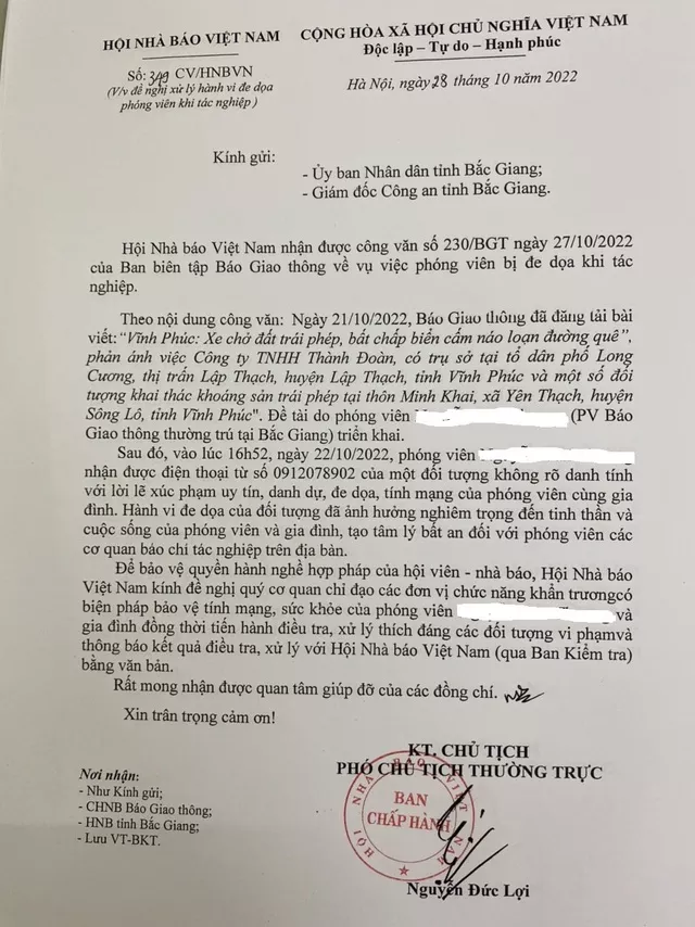 Hội Nhà báo Việt Nam vừa có văn bản đề nghị UBND tỉnh Bắc Giang chỉ đạo đơn vị chức năng điều tra, xử lý vụ phóng viên Báo Giao thông bị đe dọa.
