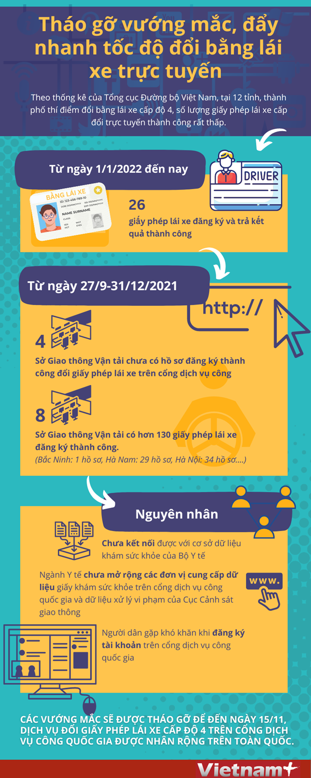 Theo thống kê tại 12 tỉnh, thành phố thí điểm đổi bằng lái xe cấp độ 4, lượng giấy phép lái xe cấp đổi trực tuyến thành công rất thấp. Cá biệt, 4 tỉnh không có trường hợp nào đổi thành công.