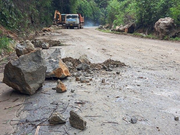 Do ảnh hưởng của mưa lớn, khoảng 40m3 đá từ đỉnh đồi lăn xuống mặt đường đã gây ách tách tắc cục bộ tại Km91+100, trên Quốc lộ 279D, khu vực dốc Cao Pha, xã Mường Bú, huyện Mường La, Sơn La.