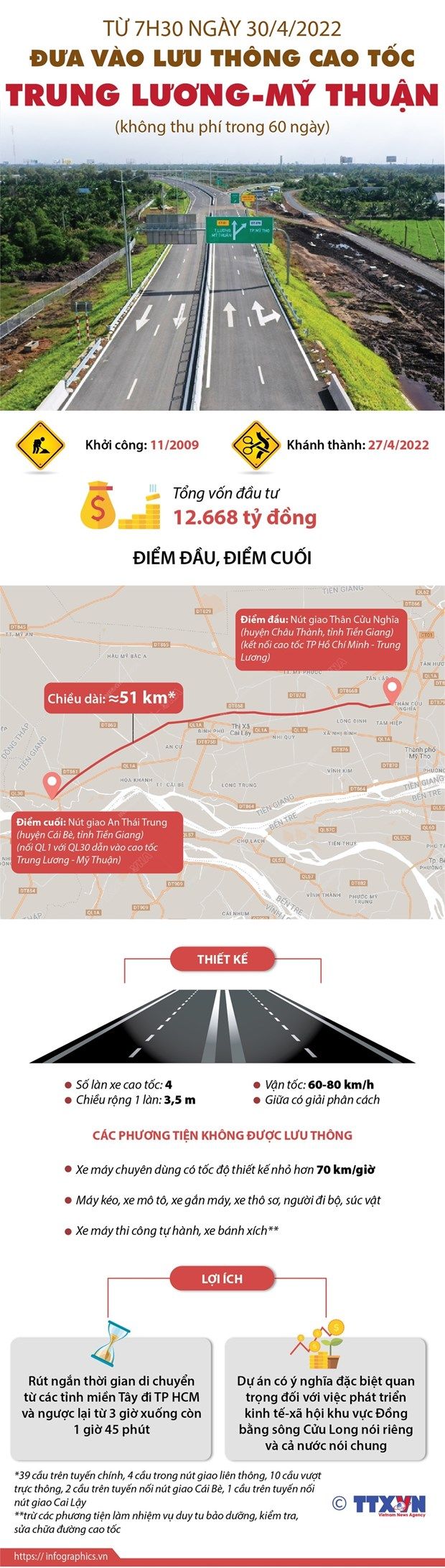 Từ 7h30 ngày 30/4: Đưa vào lưu thông cao tốc Trung Lương-Mỹ Thuận