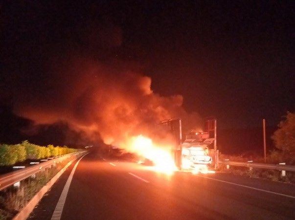 Chiếc xe đầu kéo bốc cháy dữ dội trên tuyến cao tốc, làm 3 ôtô con (1 xe Mercedes, 2 xe Vinfat) và 3 máy gặt đập liên hợp cùng 10 lưỡi cày chở trên rơmooc đều bị cháy, hư hỏng nặng.