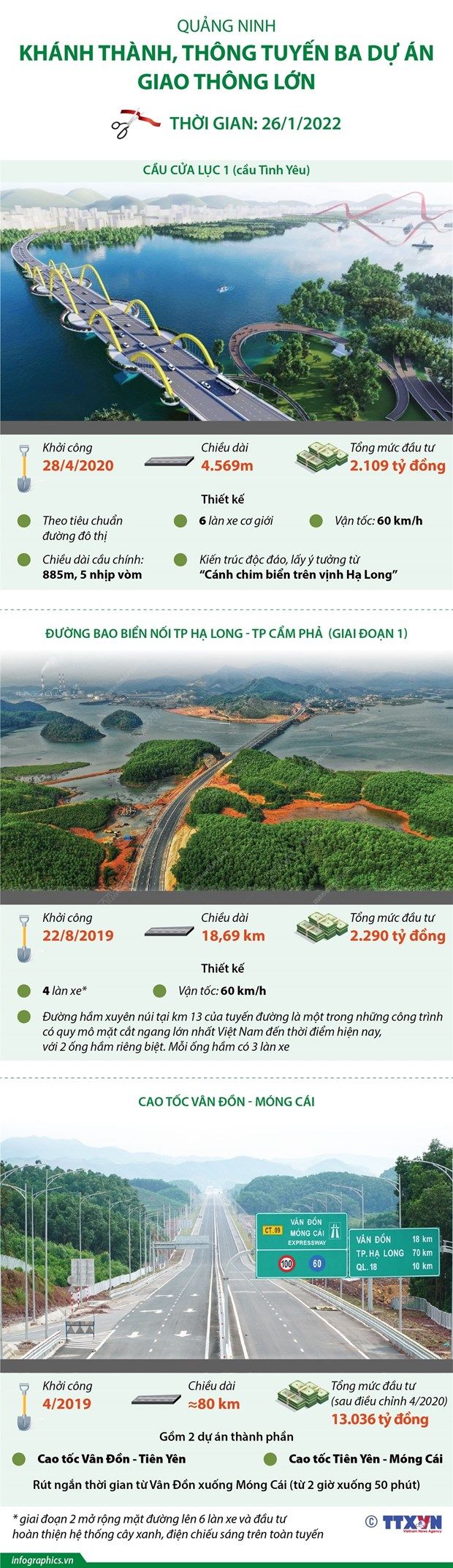 Dự án cầu Cửa Lục 1, đường bao biển Hạ Long-Cẩm Phả và cao tốc Vân Đồn-Móng Cái được khánh thành, thông tuyến kỹ thuật ngày 26/1.