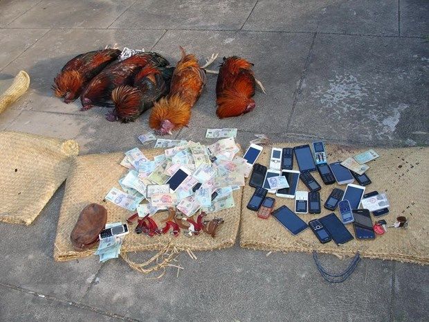 Lực lượng chức năng bắt quả tang 17 đối tượng đang tổ chức đá gà ăn tiền cùng 9 con gà, 13 điện thoại di động, 6 xe máy, thu giữ số tiền gần 55 triệu đồng và một số tang vật khác.