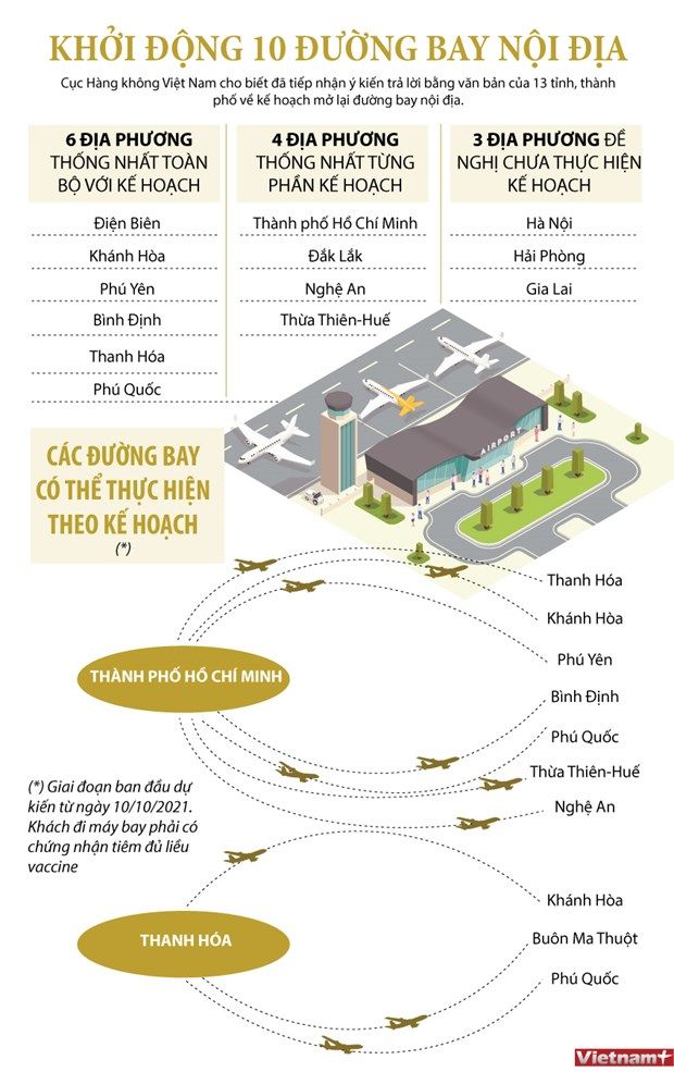 Cục Hàng không Việt Nam cho biết tính đến ngày 6/10, cơ quan này đã tiếp nhận ý kiến trả lời bằng văn bản của 13 tỉnh, thành phố về kế hoạch mở lại đường bay nội địa.