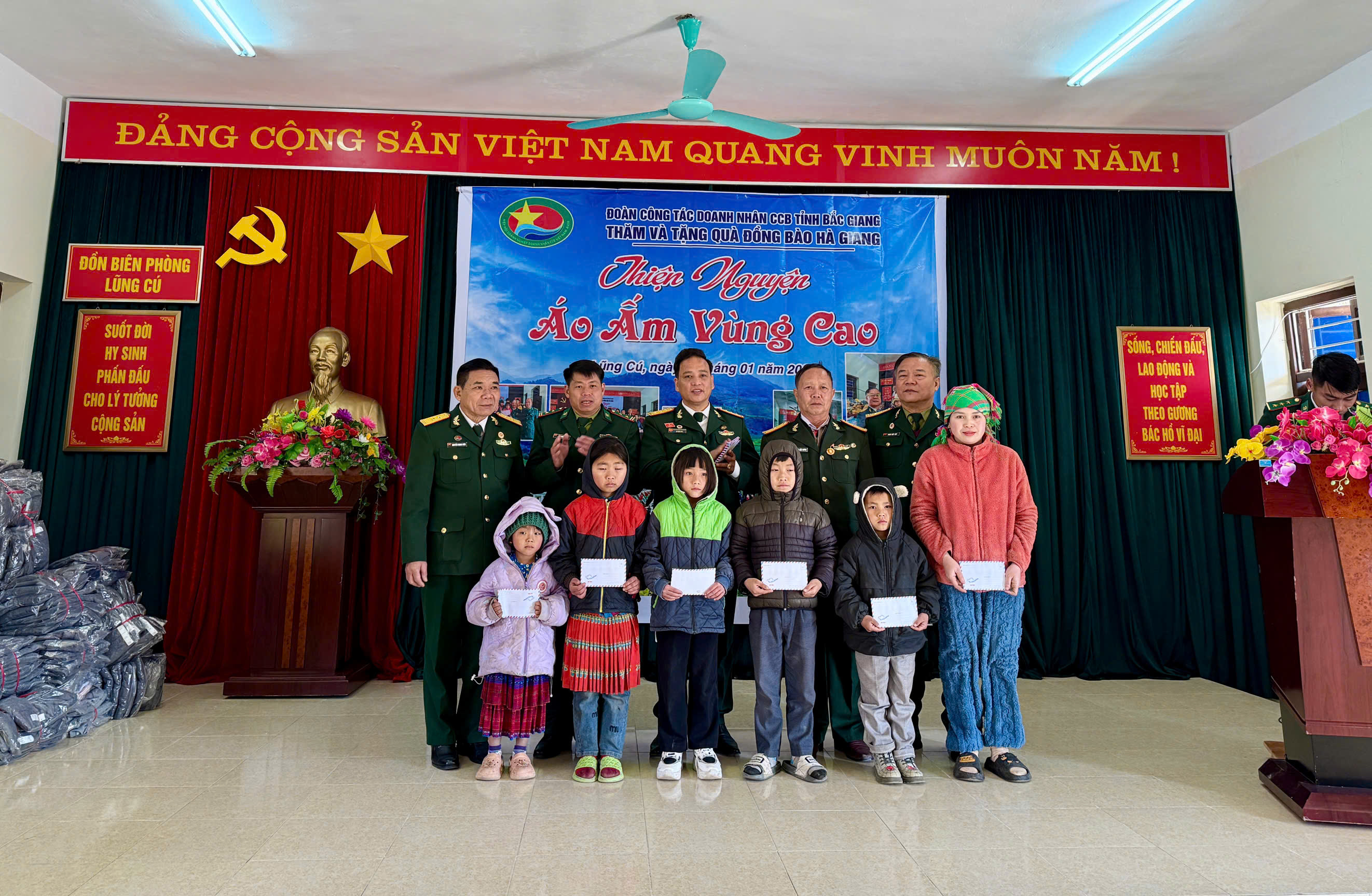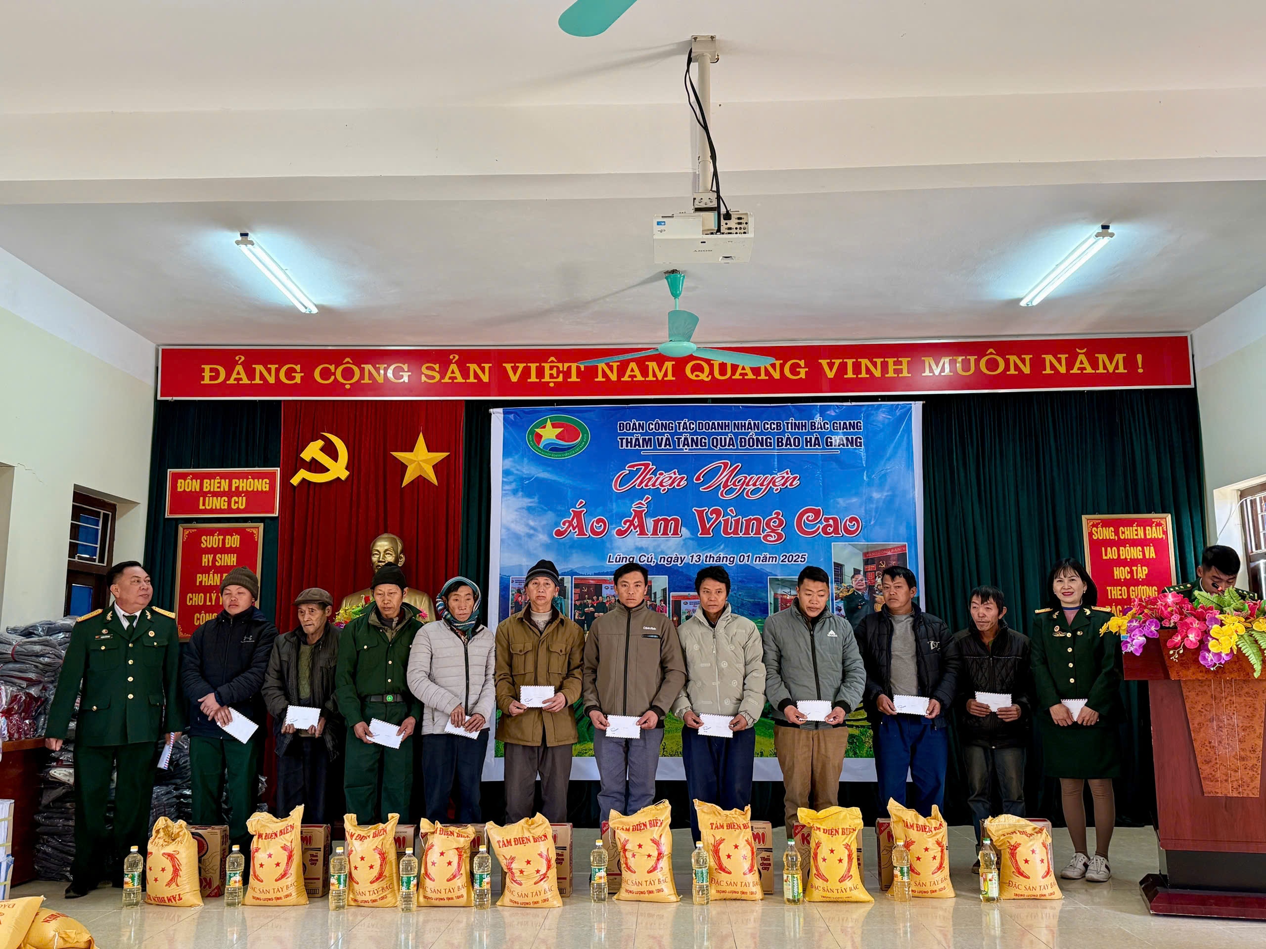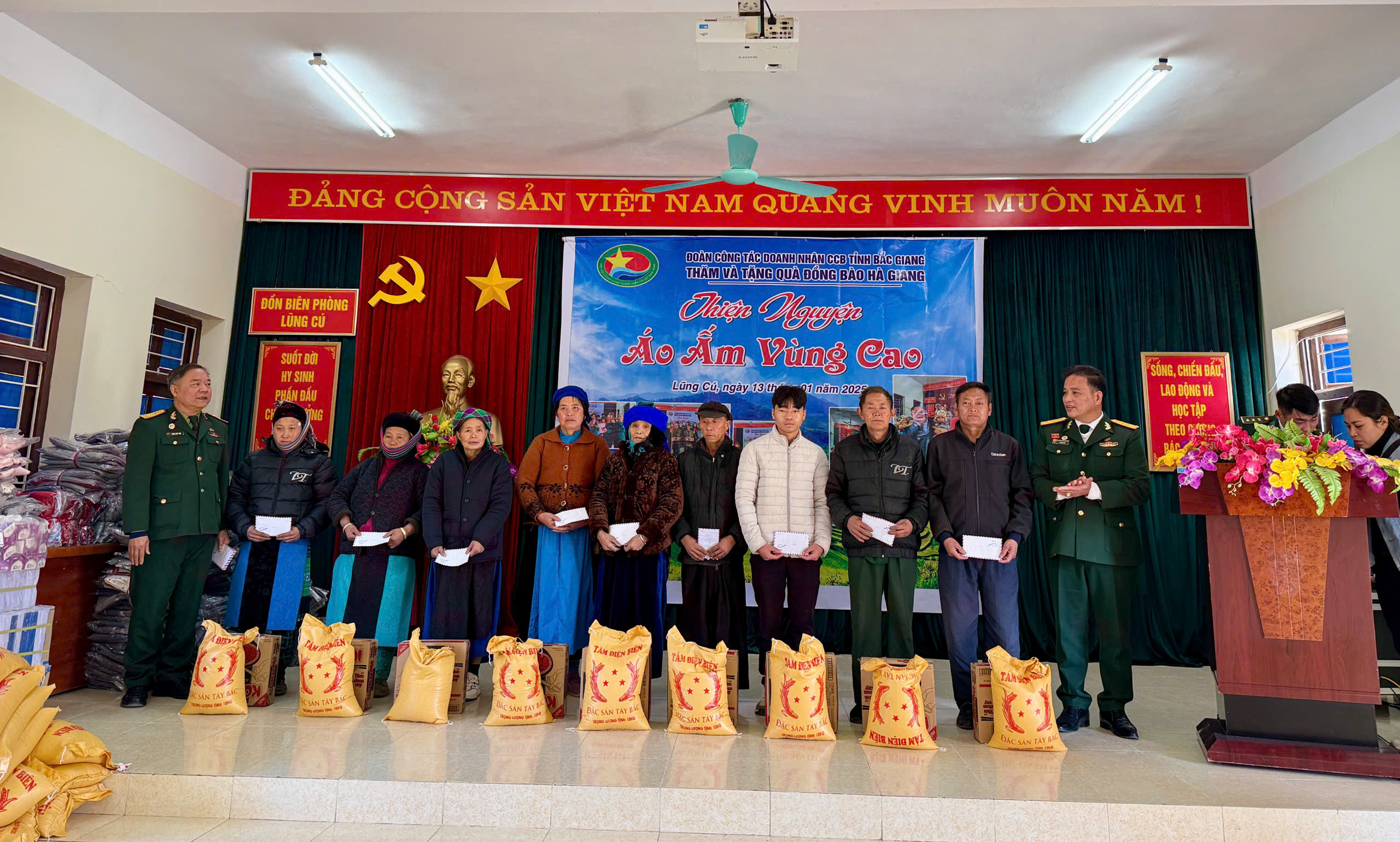 Bên cạnh đó, Hội Doanh nhân CCB tỉnh Bắc Giang cũng đã trao tặng quà Tết cho 112 hộ nghèo thuộc xã Lũng Cú và xã Ma Lé, huyện Đồng Văn; 16 hộ gia đình tham gia tự quản bảo vệ đường biên, mốc giới Tổ quốc. Các phần quà gồm tiền mặt, gạo, mỳ tôm, dầu ăn và quần áo mới, 500 cuốn vở, 500 bút bi…