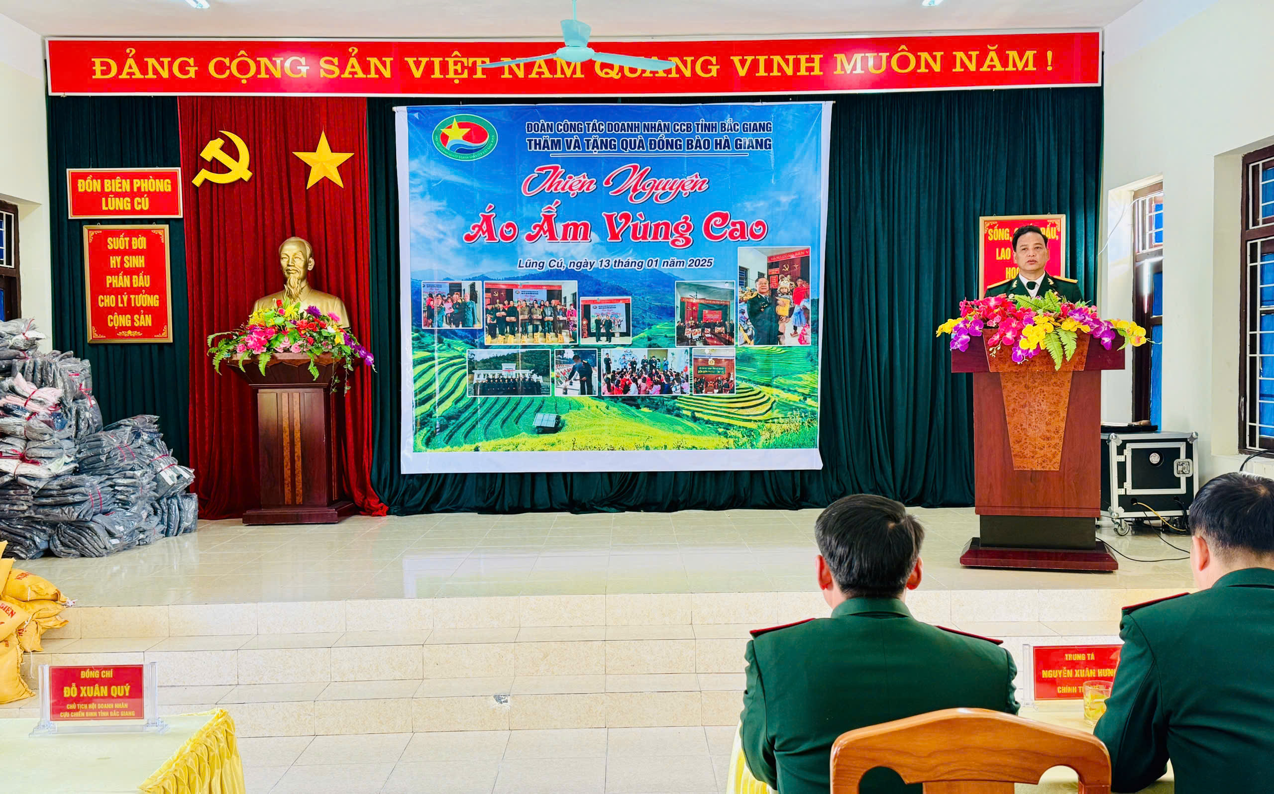 Đồng chí Trung tá Kim Xuân Giang - Đồn trưởng Đồn Biên phòng Lũng Cú, thay mặt cho Đồn và bà con đồng bào dân tộc thiểu số, học sinh có hoàn cảnh khó khăn, gửi lời cảm ơn Hội doanh nhân CCB tỉnh Bắc Giang và các nhà tài trợ đã quan tâm tới bà con khó khăn, đặc biệt là đã 4 năm đồng hành cùng Đồn hỗ trợ, nuôi dưỡng 10 cháu là con nuôi, con đỡ đầu của Đồn.