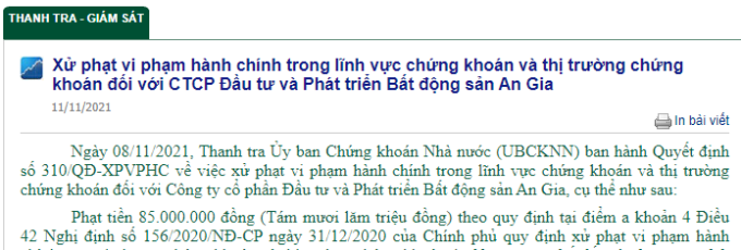 Mới đây, Ủy ban Chứng khoán Nhà nước phát đi thông báo xử phạt đối với Công ty cổ phần Đầu tư và Phát triển Bất động sản An Gia, vì đã không công bố đối với thông tin phải công bố theo quy định pháp luật.