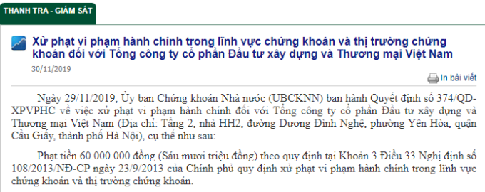 Mới đây, Ủy ban Chứng khoán Nhà nước phát đi thông báo xử phạt hành chính đối với Tổng công ty cổ phần Đầu tư Xây dựng và thương mại Việt Nam, vì đã không công bố đối với thông tin phải công bố theo quy định pháp luật.