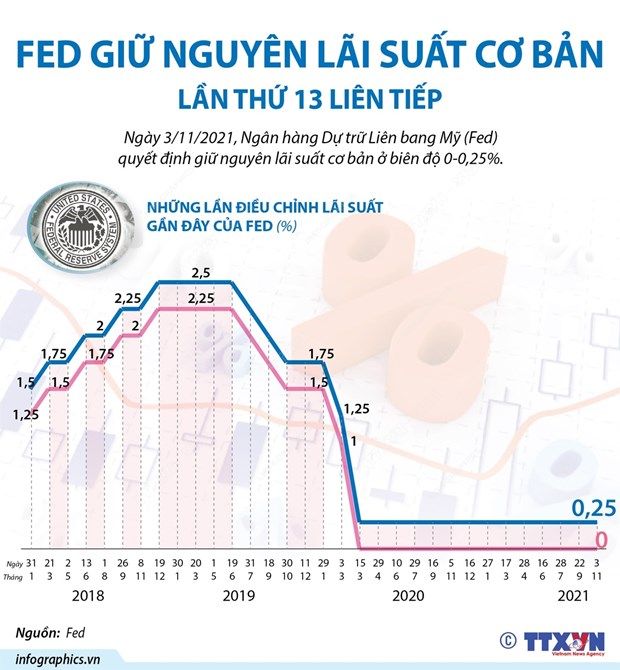 Ngày 3/11, Ngân hàng Dự trữ Liên bang Mỹ (Fed) quyết định giữ nguyên lãi suất cơ bản ở biên độ 0-0,25% và đây là lần thứ 13 liên tiếp, Fed không điều chỉnh lãi suất.